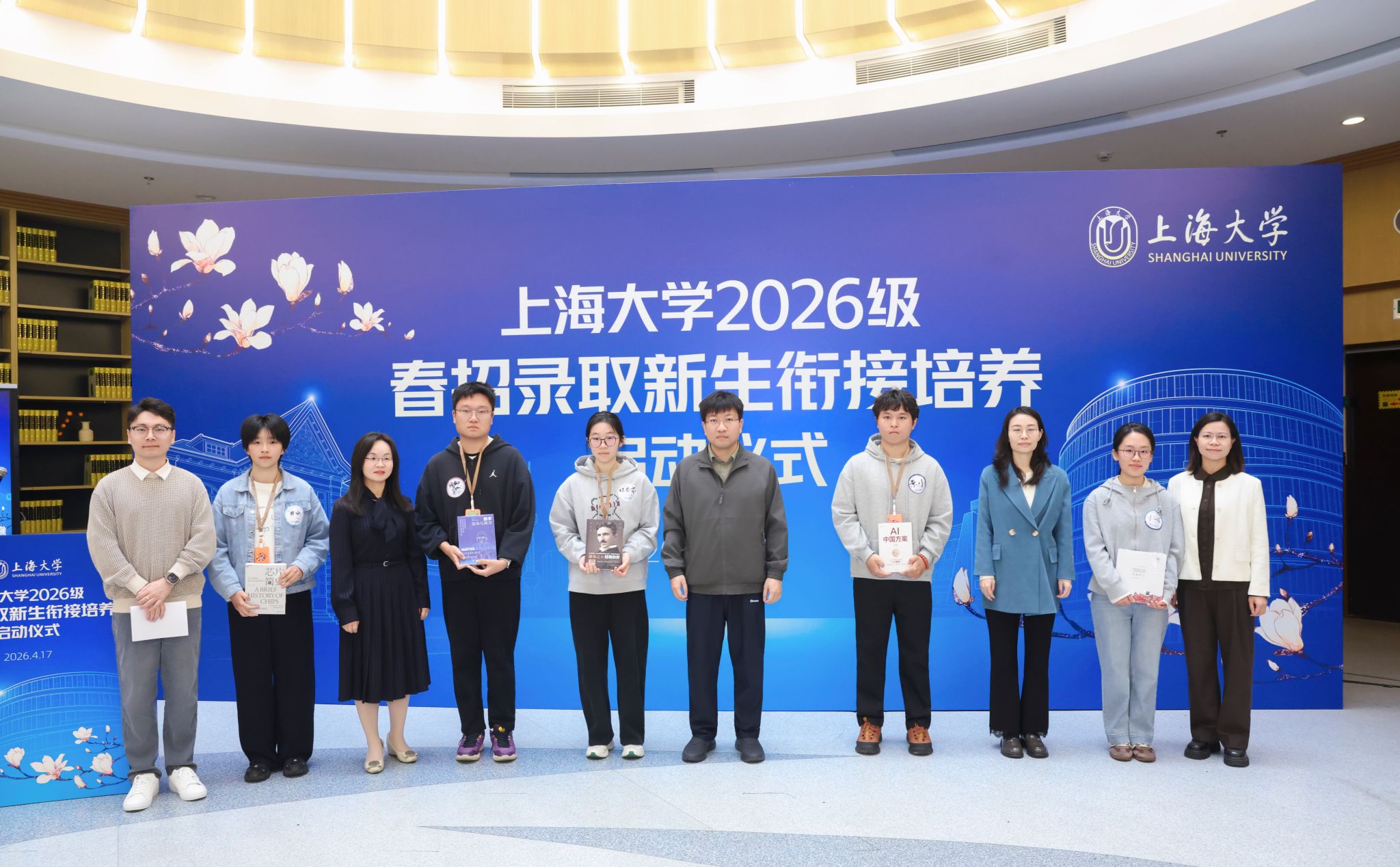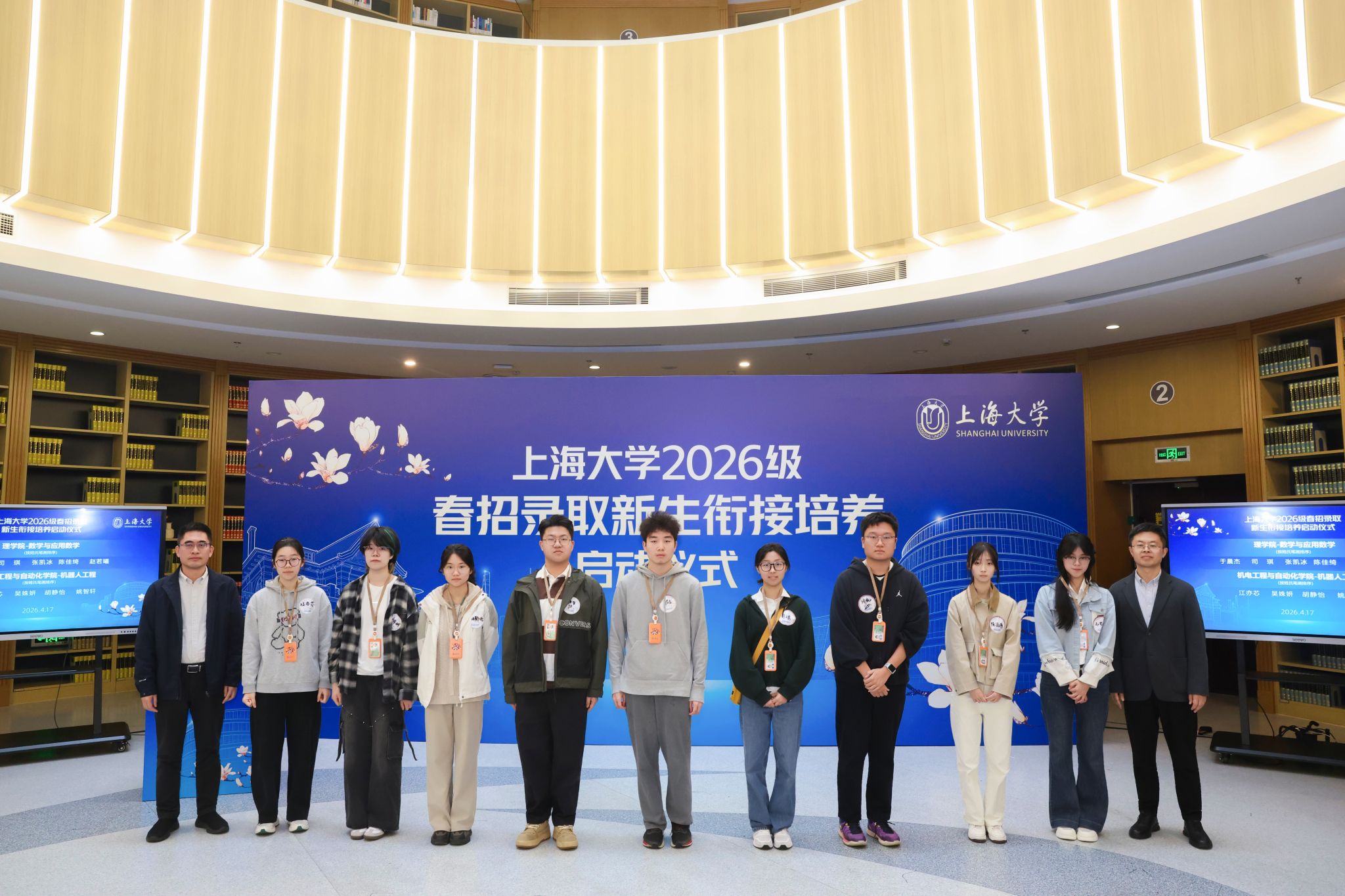 4月17日上午,机自学院春招机器人工程专业新生参加了“上海大学2026级春招录取新生衔接培养启动仪式”。学院党委书记郭纯生为同学们颁发了上大新生“身份卡”。贾文川老师作为新生导师代表与新生进行结对,为新生提供品德素养、学业规划、专业发展等方面的全方位辅导。