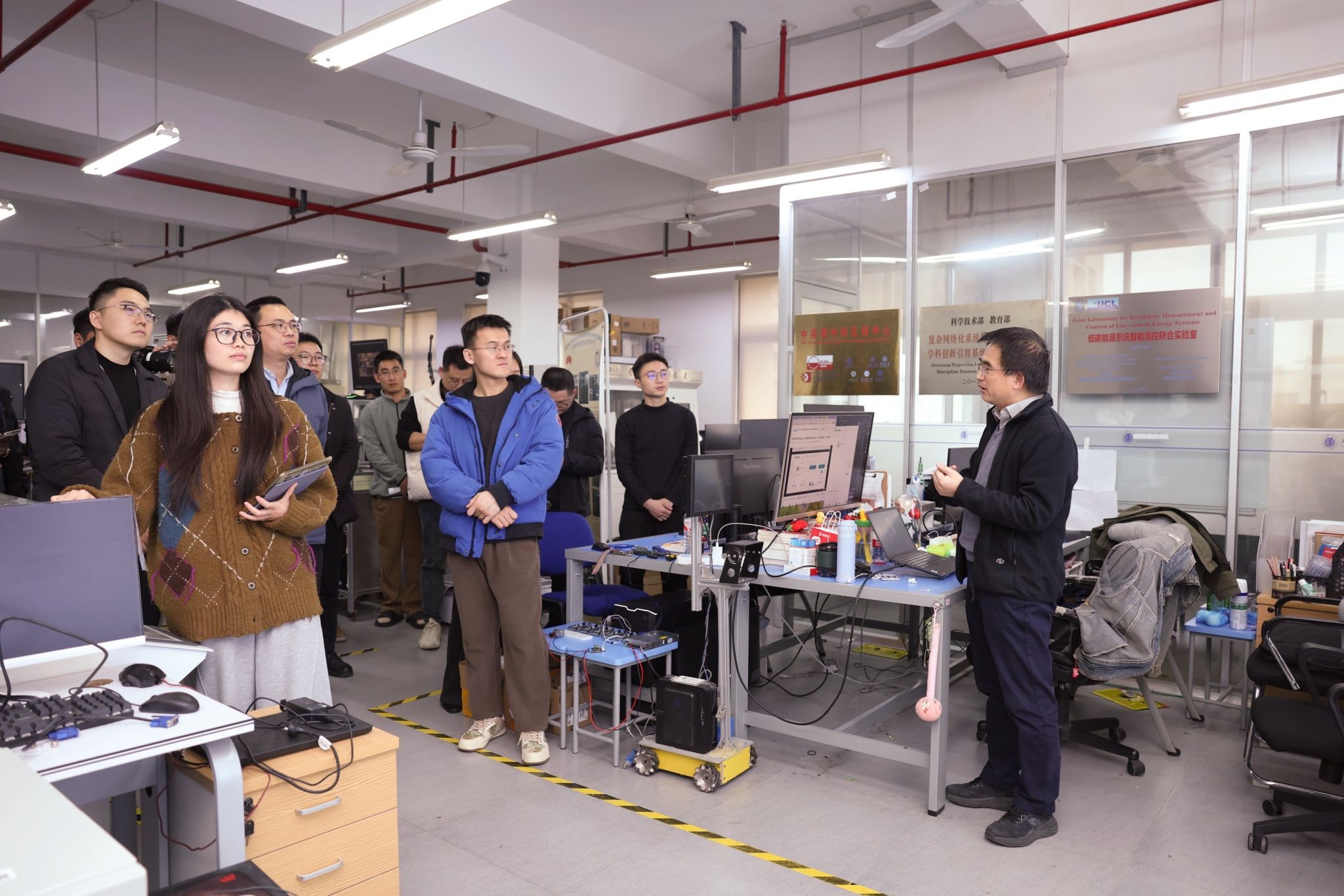 活动伊始,青年代表们首先走进上海大学网络化控制研究中心,近距离感受工业互联网与智能传感领域的前沿科研氛围。随后,参观了我院的“自强队”学生科创团队,团队在智能机器人与智能模型车设计与制作中的探索热情和实战成果,生动展现了青年学子将理论转化为实践的创新活力。