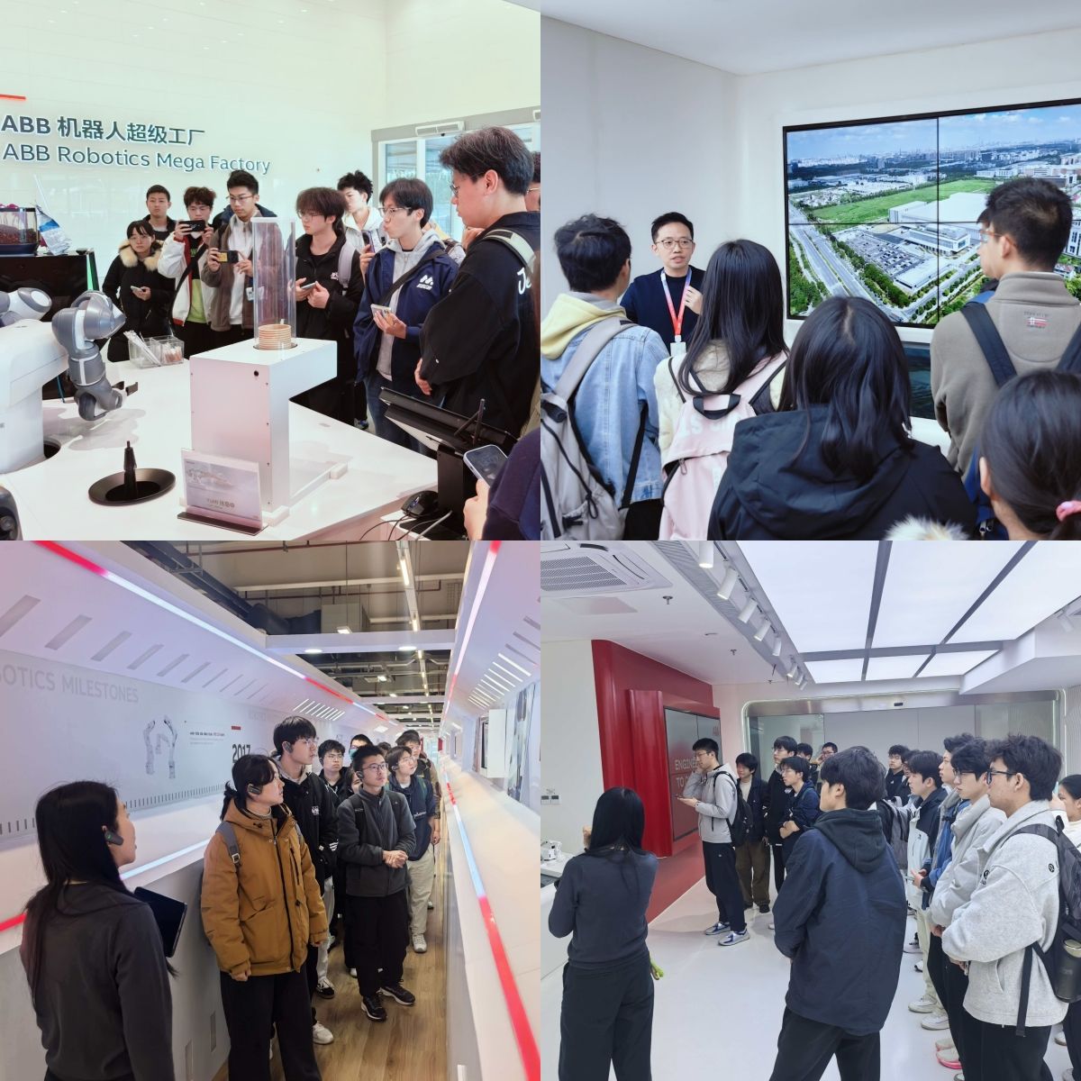 当日13:00至14:00,同学们在工作人员带领下走进ABB超级工厂核心区域。大家依次参观企业展厅与智能化生产线,系统了解ABB的发展历程、技术创新成果与全流程生产体系,直观感受机器人智能制造的高效与精密,沉浸式体验世界级工厂的现代化生产场景,对工业机器人与自动化领域有了更具象的认知。